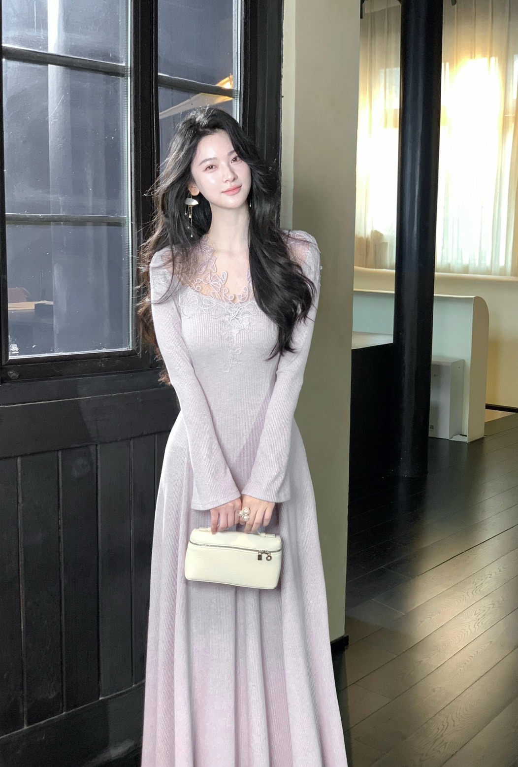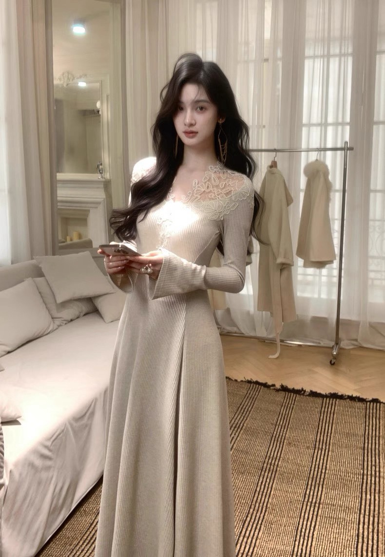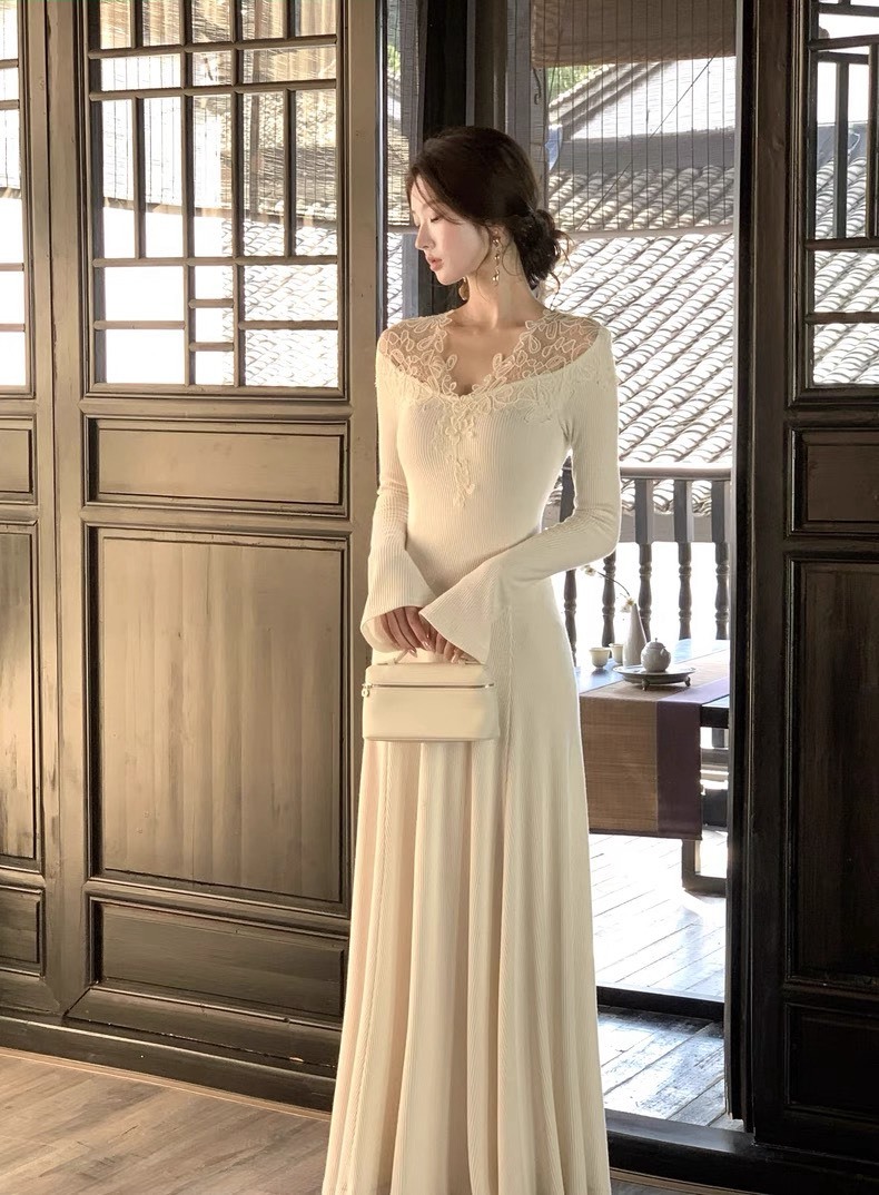 C2519 LaceMuse蕾絲拼接螺紋針織長洋裝